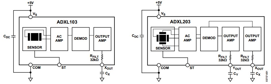 The ADXL203CE is a high precision, low power, complete single and dual axis accelerometer with signal conditioned voltage outputs, all on a single monolithic IC. The ADXL203CE measures acceleration with a full-scale range of ±1.7g. It can measure both dynamic acceleration (e.g., vibration) and static acceleration (e.g., gravity). The typical noise floor is 110 μg/√Hz, allowing signals below 1 mg (0.06° of inclination) to be resolved in tilt sensing applications using narrow bandwidths (<60 Hz). The user selects the bandwidth of the accelerometer using capacitors CX and CY at the XOUT and YOUT pins. Bandwidths of 0.5 Hz to 2.5 kHz may be selected to suit the application. The applications of the ADXL203CE include Vehicle dynamic controls, Electronic chassis controls, Platform stabilization/leveling, Navigation, Alarms and motion detectors.